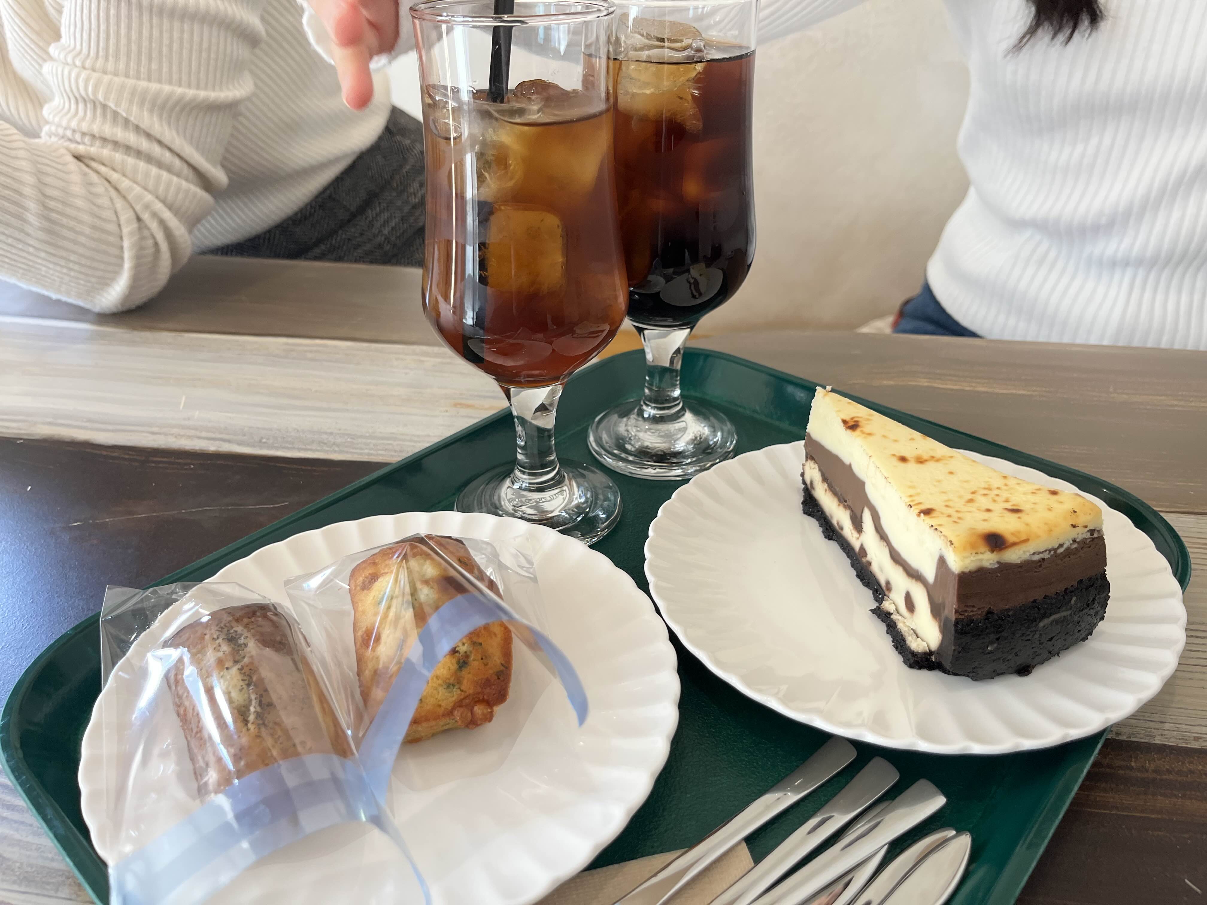 마블 초콜릿칩 치즈케이크, 콜비잭치즈&릭 휘낭시에, 얼그레이 휘낭시에, 콜드브루 디카페인 2잔 (2잔은 연하게)